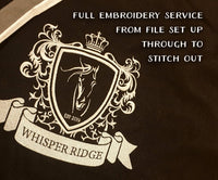 I can also take your logo and digitize it ready to embellish your Rugs, Saddle Cover, Stirrup Bumpers or Stirrup Covers. The perfect marketing tool when your out and about with your horses.