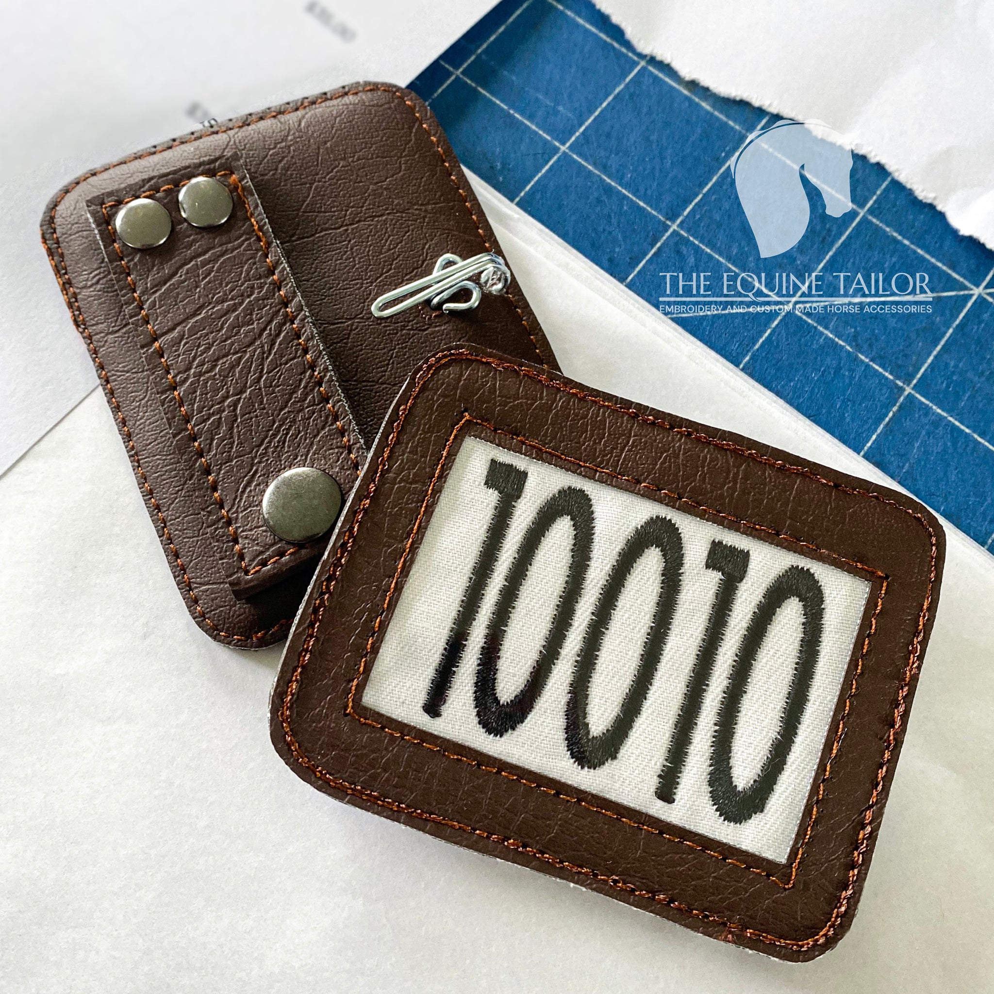 Embroidered Bridle number encased in a vinyl faux leather textured holder which attaches to your bridle.